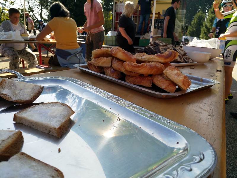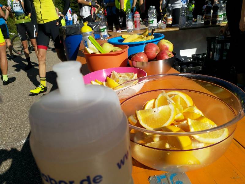 So kam es das man nach nur einer Stunde und 50 Minuten bereits deutlich vor der geplanten Zeit die erste Versorgungsstation kurz hinter Trachtenmoden Fischer erreichte. Die Tische waren reichlich mit Obst, Schokolade, belegten Broten, isotonsichen Getränken und einer wahrlich würzigen Brühe gedeckt. Nach genau 16 Minuten Rast wurden die Räder wieder bestiegen und in einer rasanten Abfahrt ging es steil hinab nach Elzach. Auch knifflige feuchte hochgeschwindigkeitskurven meisterten die ASpoNaten souverän.