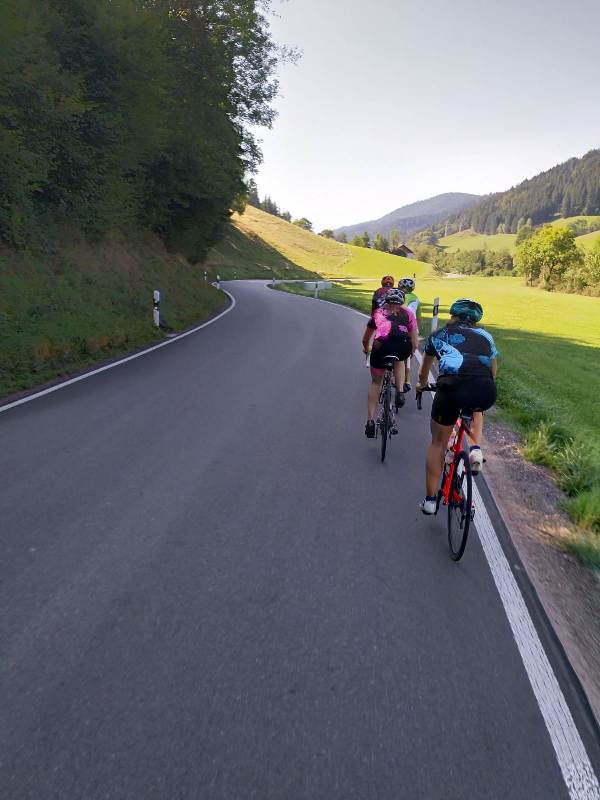 Arm- und Beinlinge erwiesen sich auf den ersten Kilometern als sehr hilfreich. Es war doch noch recht frisch. Im Windschatten der „Trainingsgruppe Schömberg“ ging es in kontrolliertem aber flottem Tempo also von Alpirsbach auf kleinen Nebensträßchen hinab bis Steinach. Zur körperlichen Leistung kam die Wärme der über den Gipfeln des Schwarzwaldes malerisch aufsteigenden Sonne, so dass die langen Ärmel bald ausgedient hatten.