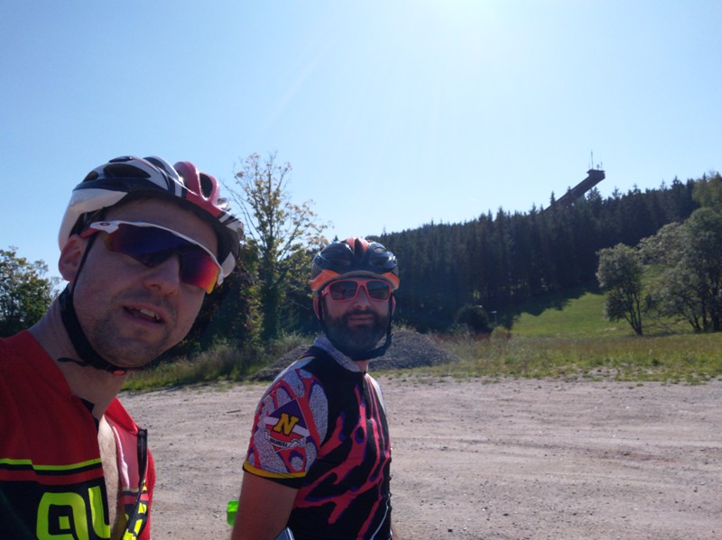 Nach dem Motto wer rastet der rostet wurde auch hier keine unnötig lange Pause eingelegt. Es warteten ja auch noch einige Kilo- und Höhenmeter. Weiterhin frohen Mutes wurde der Abschnitt in Angriff genommen. Durch Schonach und vorbei an der Langenwaldschanze (Heimat mehrerer Weltmeister und Olympiasieger) folgten zahlreiche mehr oder weniger lange und steile Anstiege. Nach dem letzten Anstiegen übernahm der Captain die Führung und wie der geölte Blitz schoss das Team Loire-Gloire nach St. Georgen. Das Teilstück nach Peterzell auf dem Radweg entlang der Bundesstraße darf als das landschaftlich unspektakulärste bezeichnet werden. Nach kurzer Verschnaufpause an der roten Ampel mußte vor der letzten Verpflegungsstation nur noch der Anstieg quer durch Peterzell bewältigt werden.