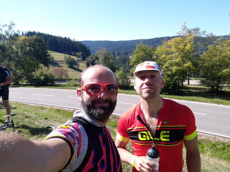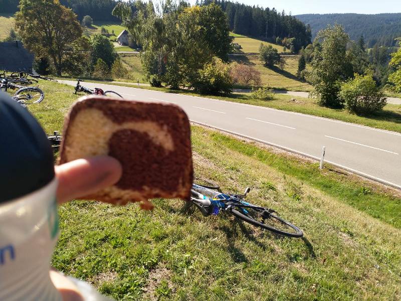 Mit dieser starken Physis und Psyche übernahmen nun auch Captain und König zusehends Führungsarbeit. Das Höhenprofil auf dem Edge verlor mit jedem Kilometer an Schrecken. Dann eine kurze Schrecksekunde. Mitten auf der Straße stand ein Rettungshubschrauber. Konnte dieser aufgrund der günstigen Parksituation und der breiten Straße noch gut passiert werden war wenige Meter später kein Durchkommen mehr. Die Straße war durch einen Rettungswagen, ein Notarteinsatzfahrzeug und ein Fahrzeug des ärztlichen Notfalldienstes gänzlich blockiert. Überrascht hat in dieser Situation, in der offensichtlich ein Radfahrer ärztlicher Hilfe bedurfte, die große Ruhe der versammelten Radsportler. Niemand drängelte, niemand schob sich vorbei, es wurden keine Fotos gemacht. Erst als der Verunglückte in den RTW verbracht und durch den Rettungsdiest ein freier Durchgang geschaffen wurde setzten sich die 60 bis 80 Radler unter gegenseitigen guten Wünschen einer sicheren Fahrt wieder in Bewegung. Nur wenige Kurven später überraschte dann die zweite, ähnlich üppige Verpflegungsstation. Diesmal gab es auch noch Kuchen und als Zugabe ein herrliches Schwarzwaldpanorama.