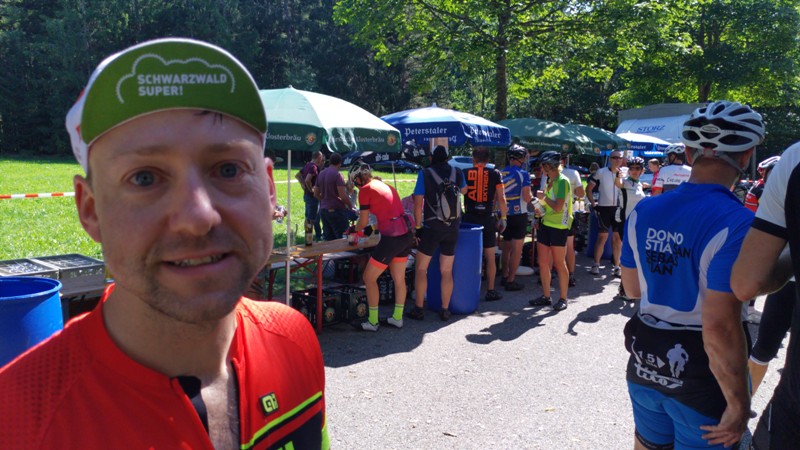 Wieder dauerte die Nahrungs- und Flüssigkeitsaufnahme nur knappe 14 Minuten. Der Bierausschank an der Verpflegung hielt scheinbar zahlreiche Radsportler von der raschen Weiterfahrt ab und so machten sich Capitain und König allein auf das letzte Teilstück. Am Waldrand entlang ging es relativ flach und mit gutem Tempo dahin. Der könig fand auch hier noch Energie zu einem Vortrag über das danubische und rhenanische System und die Schönheit des Schwarswaldes im allgemeinen.