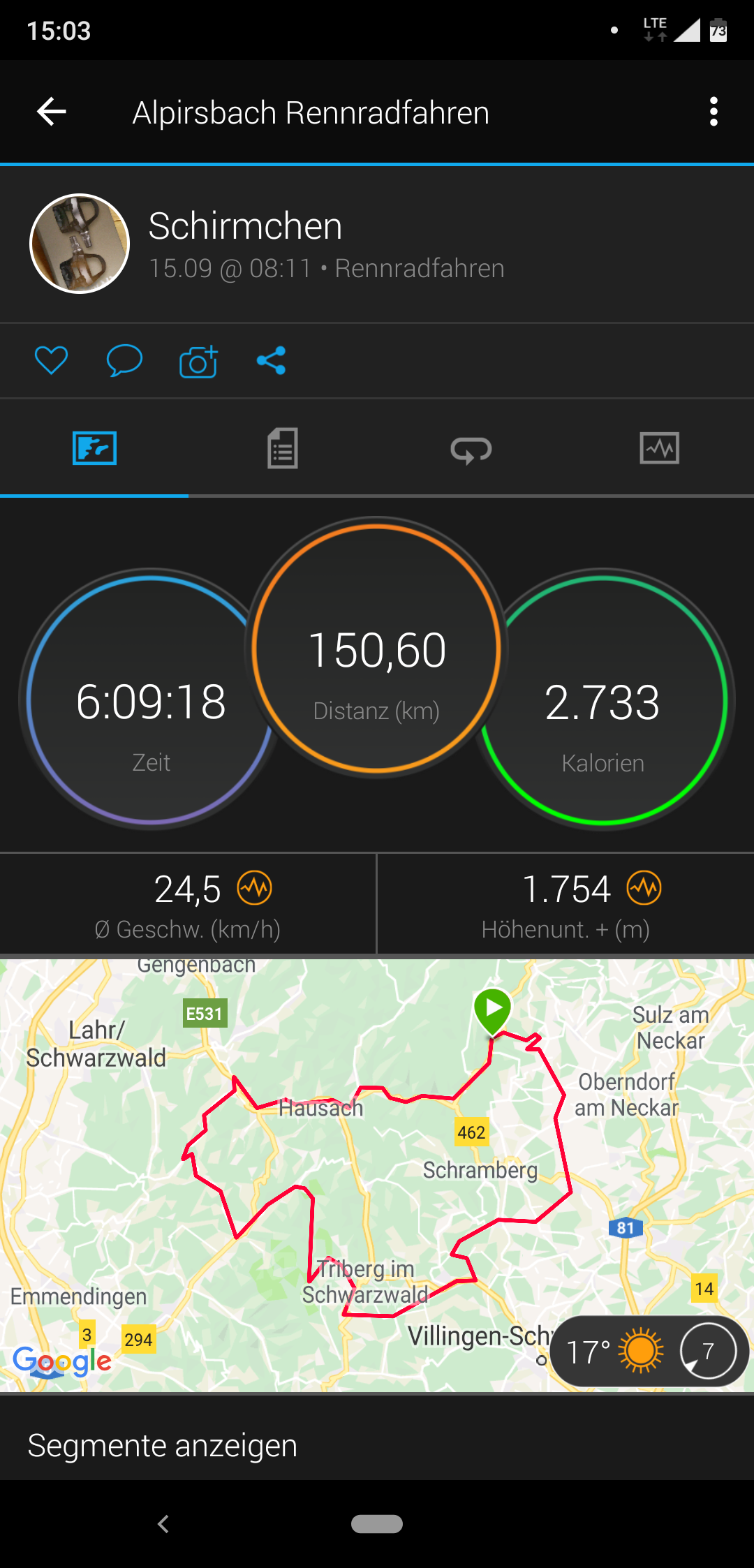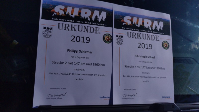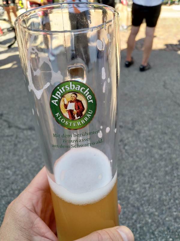 Einem letzten kurzen Anstieg folgte eine weitere halsbrecherische Abfahrt in absolutem Renntempo hinab nach Alpirsbach. Eine kurze Ungweissheit ob des korrekten Streckenverlaufs zum Ziel lies sich rasch lösen und so erreichte Loire-Gloire nach 150,6km und 1960 Höhenmetern in gerade einmal 6:09 Stunden bzw. 5:22 Stunden reiner Fahrzeit bei bester Gesundheit und glücklich das Ziel und damit das wohlversiente alkoholfreie Alpirsbacher Weizen.